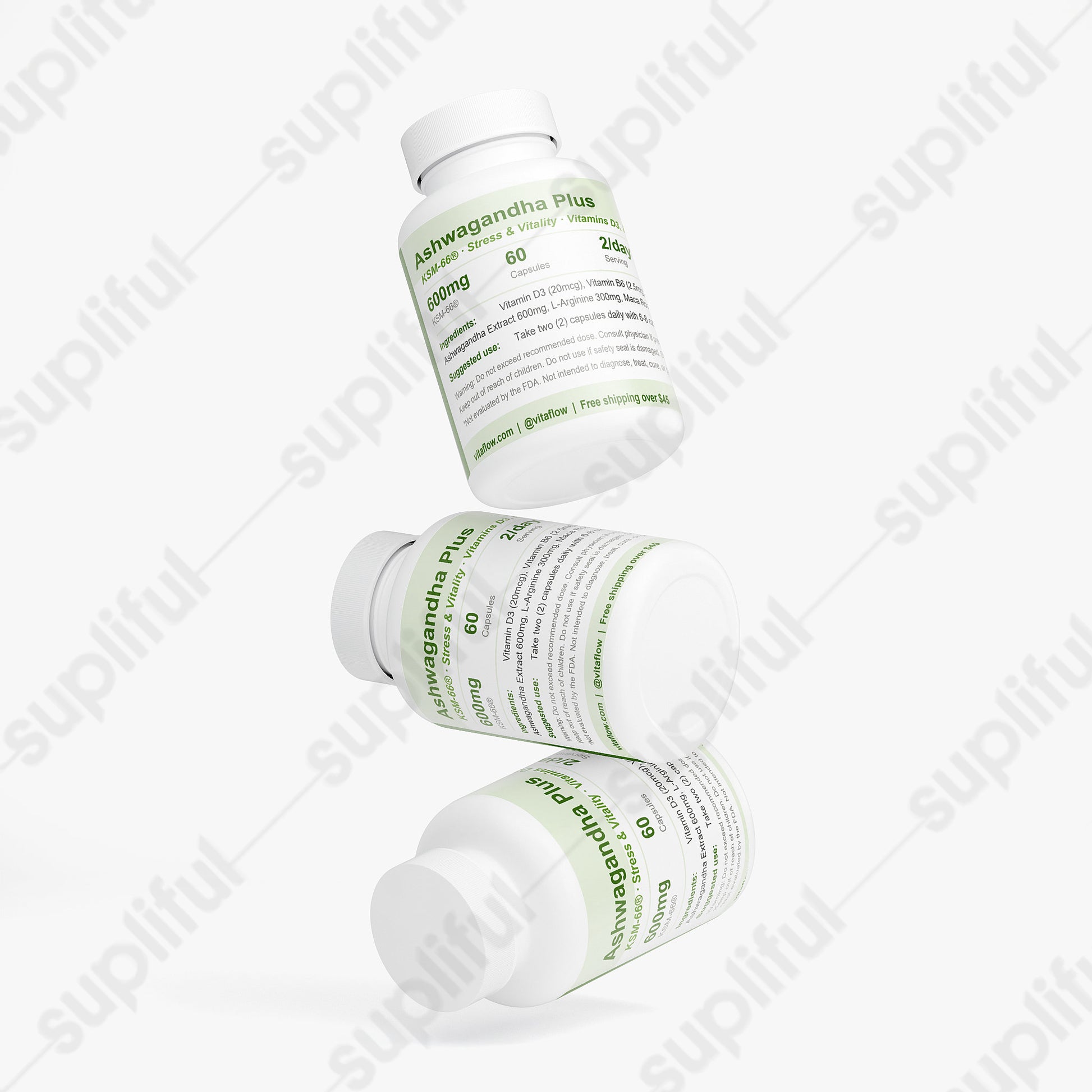 Ingredients: Vitamin D3 (as Cholecalciferol) (20 mcg), Vitamin B6 (as Pyridoxine Hydrochloride) (2.5 mg), Vitamin B12 (as Methylcobalamin 1%) (25 mcg), KSM-66® Ashwagandha Extract (standardized to 5% Withanolides) (600 mg), L-Arginine (300 mg), Maca Root Powder (Lepidium meyenii) (root) (150 mg), Panax Ginseng Powder (root) (100 mg), Shatavari Powder (Asparagus racemosus) (root) (50 mg), HPMC (vegetable capsule).
