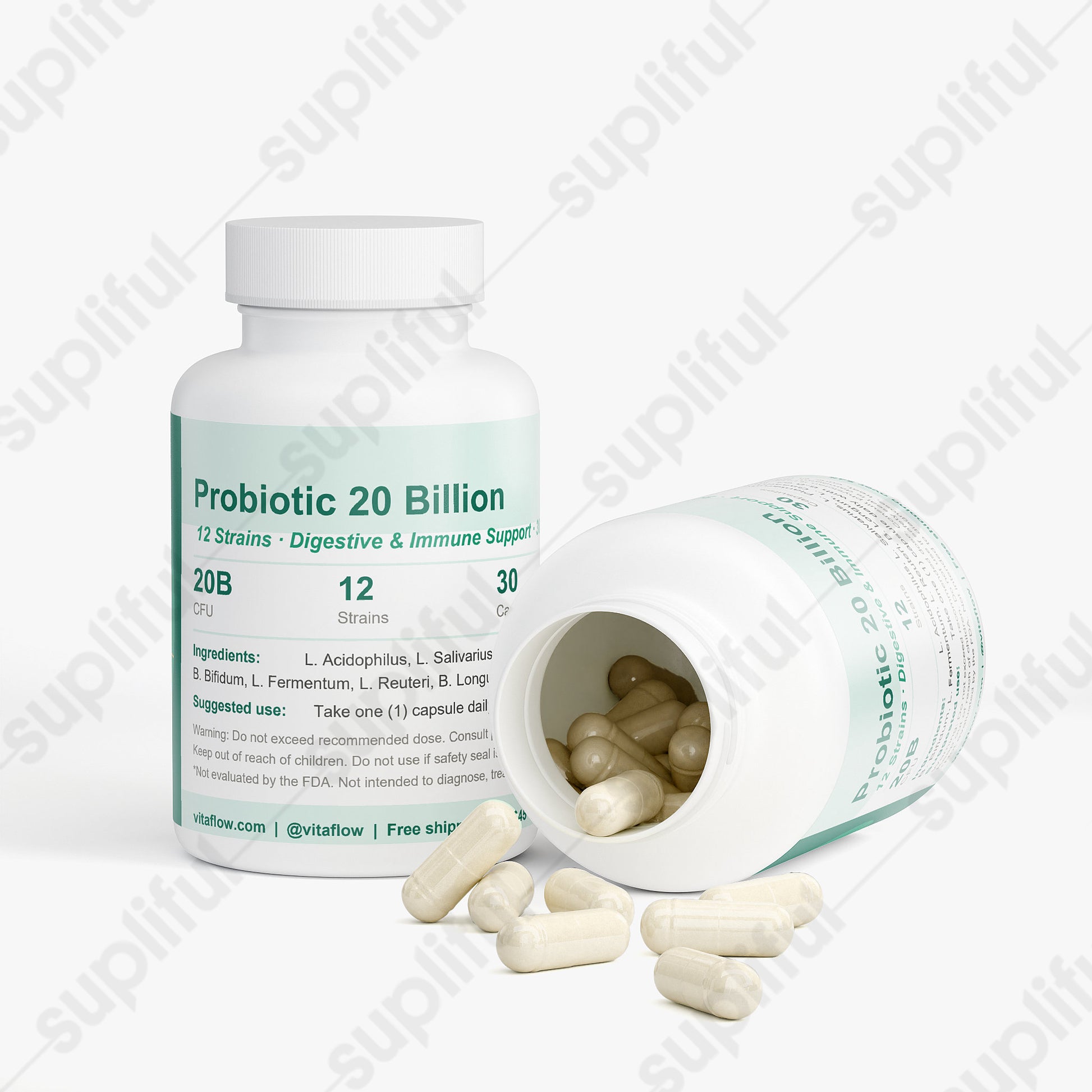 This probiotic dietary supplement is specially formulated to support digestive and immune health through a carefully selected blend of beneficial bacteria. Each capsule contains a robust blend of probiotic strains such as L. Acidophilus, L. Rhamnosus, B. Lactis, among others, complemented by Brown Rice Flour and encapsulated in a vegetable capsule. Designed for daily intake, this supplement aims to enhance the balance of gut flora, promote digestive health, and support the immune system, leveraging the natural benefits of probiotics to improve overall wellness without relying on artificial additives.*
